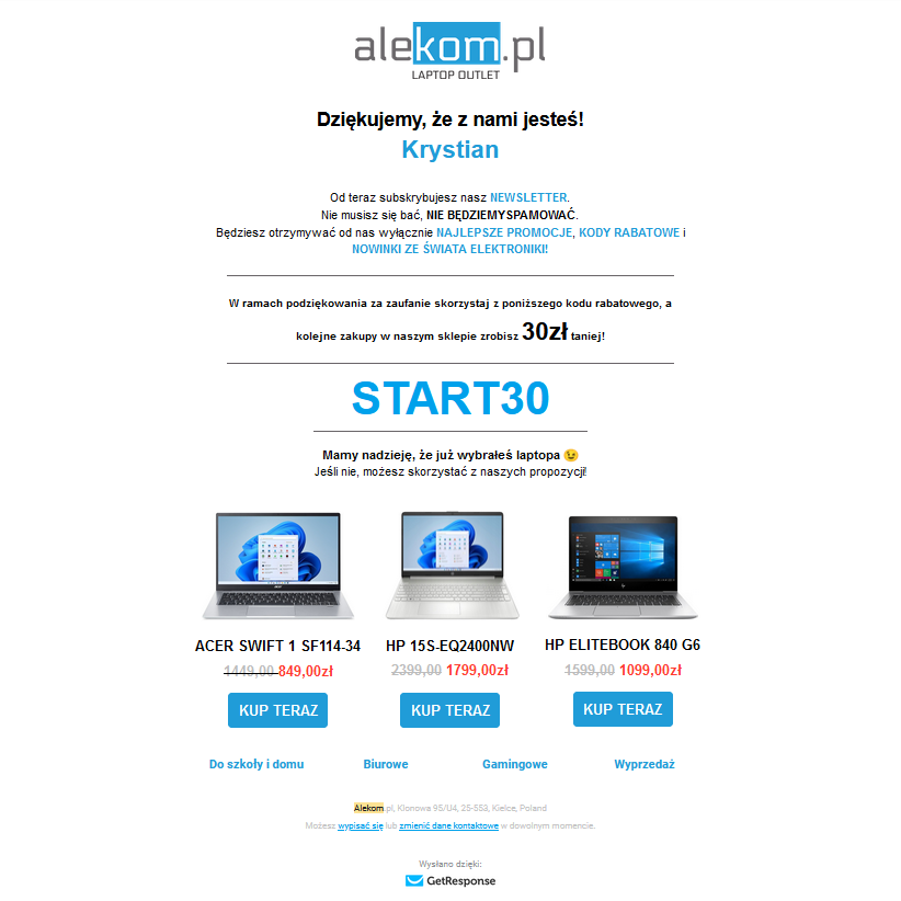 Przygotowałem mail powitalny zawierający personalizację (podane w formularzu imię) dla każdego klienta. Była ona zawarta w tytule maila (co miało zwiększyć otwieralność) oraz bezpośrednio w treści.