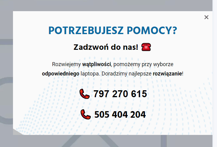 Za pomocą GetResponse stworzyłem również pop-up, który wyświetlał się klientom, którzy przebywali dłuższy czas na stronie. Informował on o możliwości kontaktu z obsługą klienta w razie wątpliwości przy wyborze produktu.