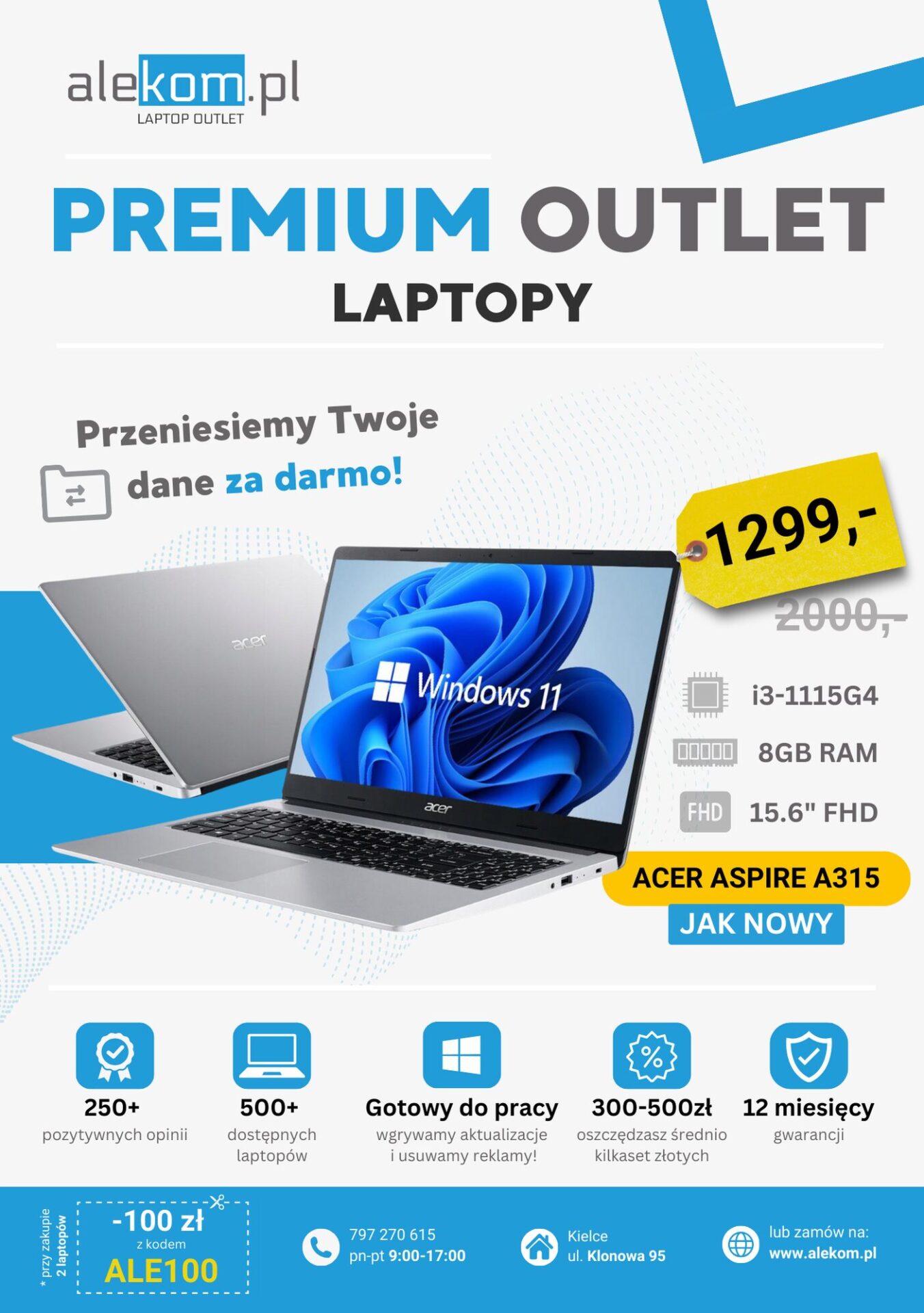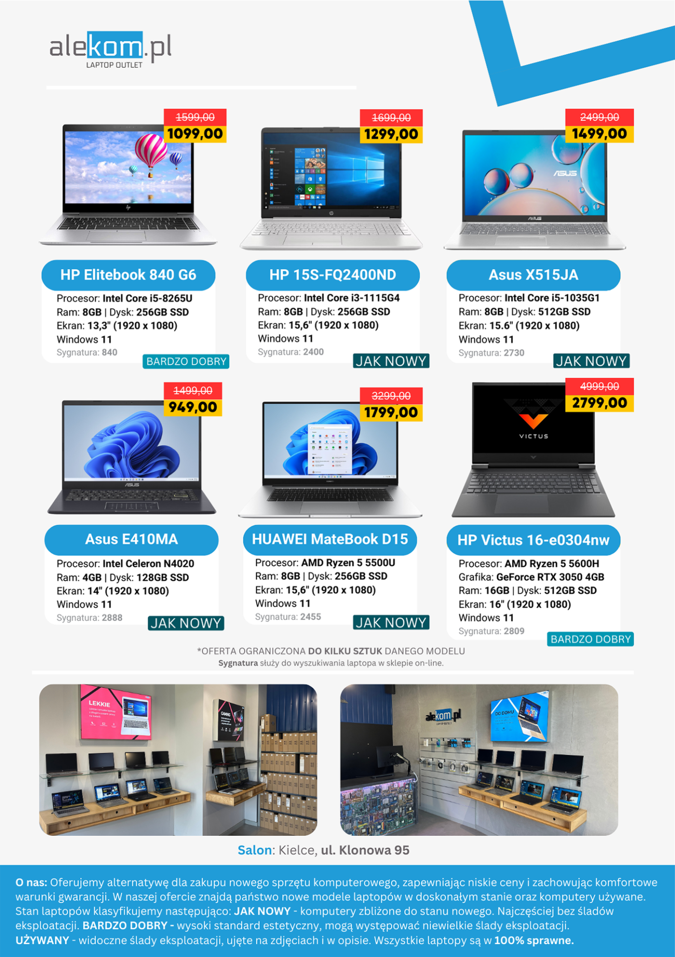 Na odwrocie znalazły się najpopularniejsze w naszej ofercie laptopy z różnych kategorii. Dodaliśmy również zdjęcia salonu, w celu uzyskania jak największego zaufania do przedstawionej oferty.